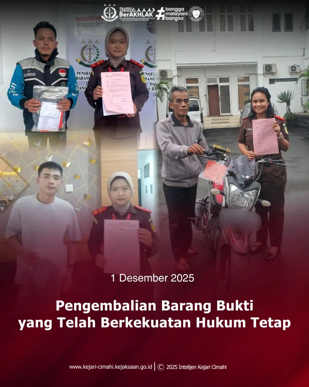 Senin, 1 Desember 2025 — Kejaksaan Negeri Cimahi melalui Seksi Pemulihan Aset dan Pengelolaan Barang Bukti melaksanakan kegiatan pengembalian barang bukti yang telah memperoleh kekuatan hukum tetap (inkracht).